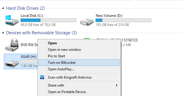 Step 2: Open explorer and Right click on your Removable drive and Select “Turn On Bitlocker”