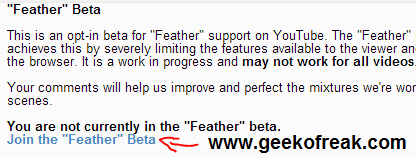 Just Click on Join The “Feather” Beta. Now search your liking Video and you will see the difference, What it does is it doesn not load share plugins and related video tab, resulting into Streaming the videos Faster.