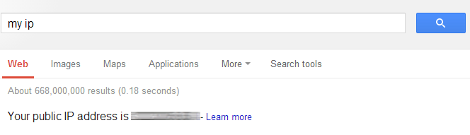 Google will Provide You Your IP address very quickly. Just Search for ” What is my Ip” or ” My Ip “.You will Get Your Ip in Just a Couple Of Seconds.