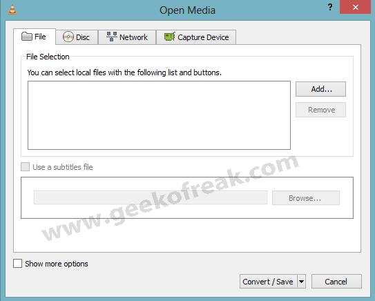 Step 1: Open VLC , Click on MEDIA > Convert/Save Or Press Ctrl+R . You will see A window like Below Pic.