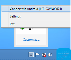 Step 3: After Download the Drivers You will see a Tray Icon. Now Connect Your Android Phone With USB Cable,Enable USB Debugging, Then Goto the Tray Icon, Right Click on it and click on Connect Via Android.